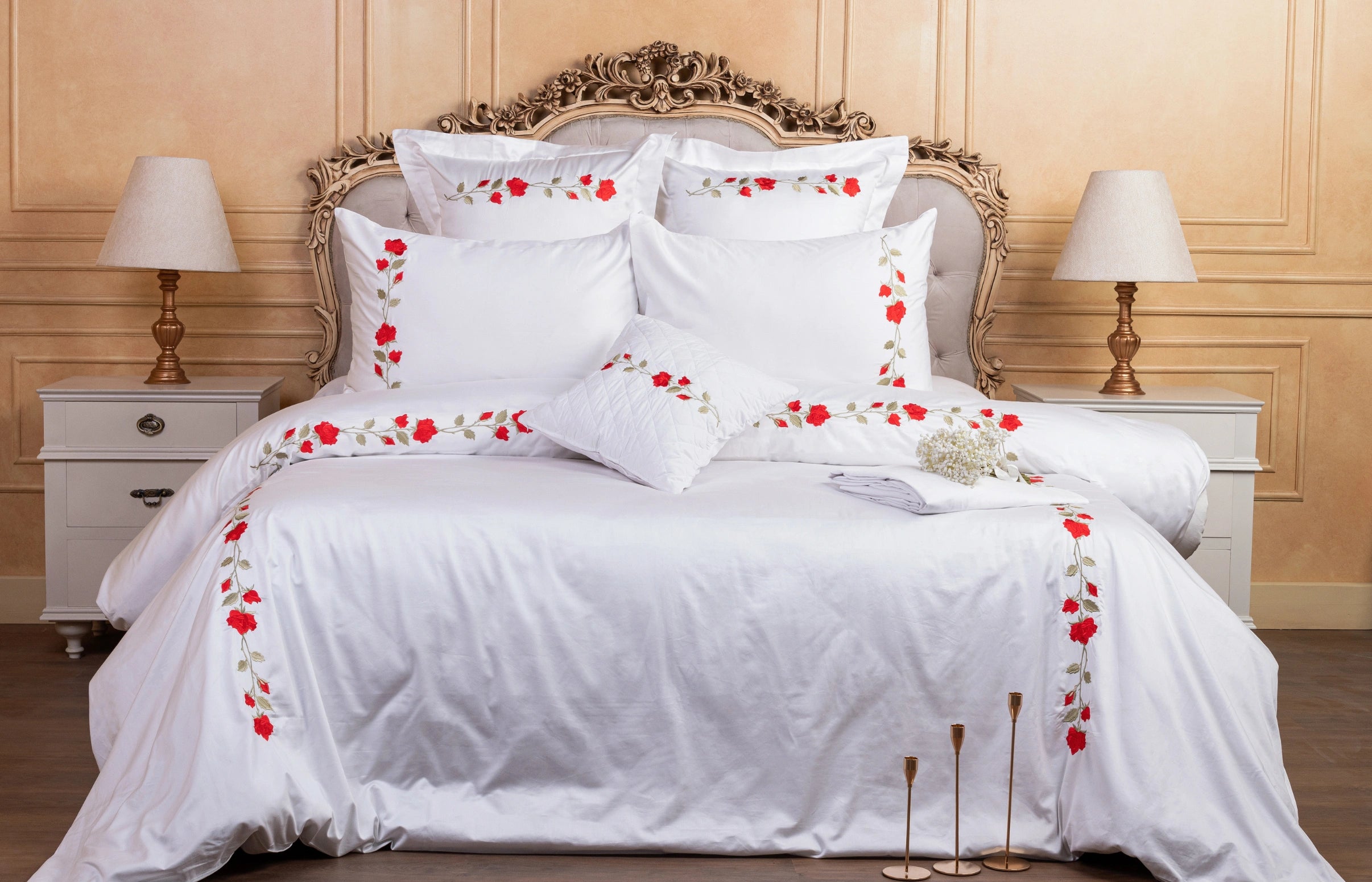 the Red Love Flower 600 TC sateen Egyptian Cotton in bold red floral design. A romantic and luxurious statement piece.